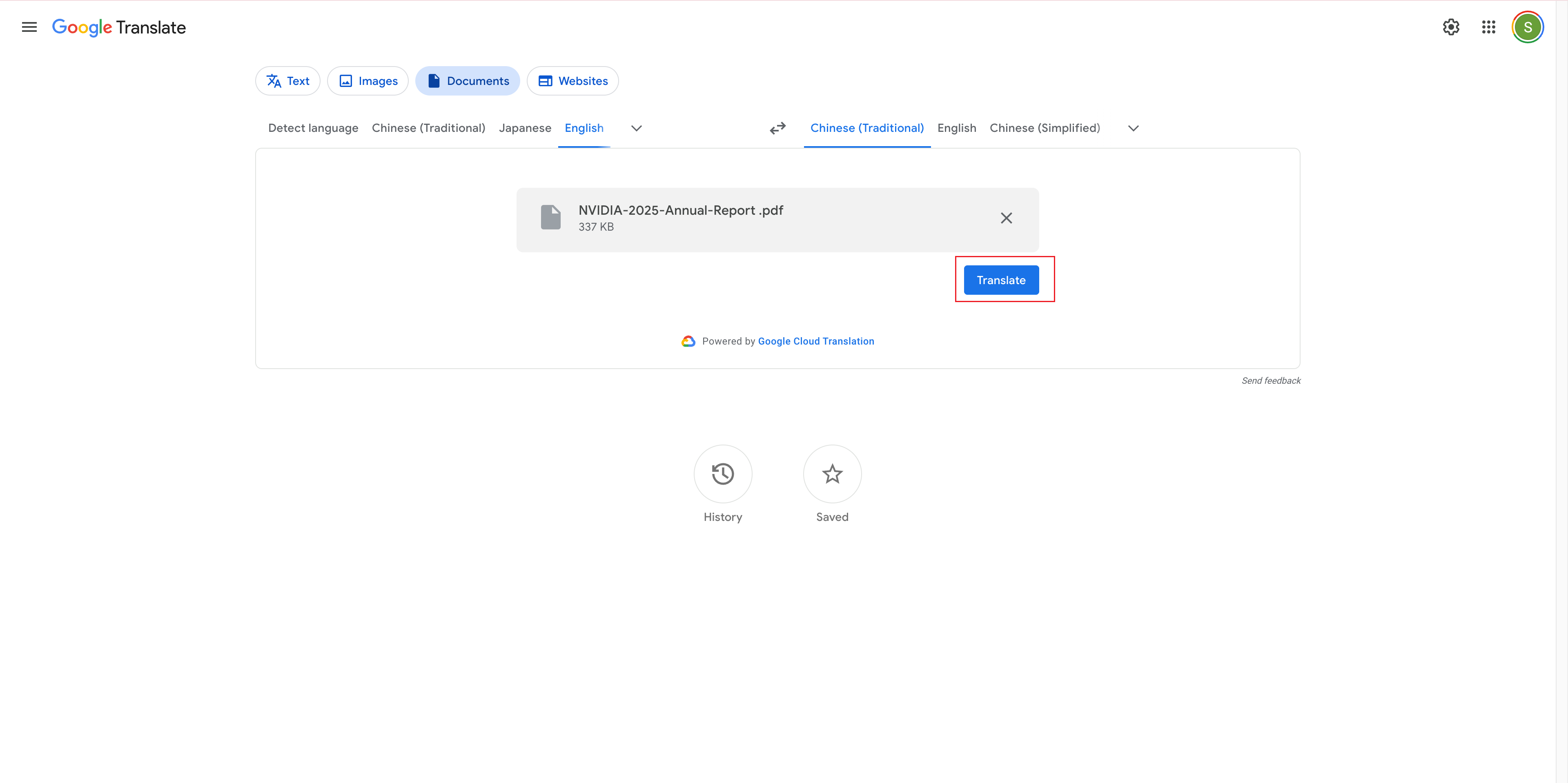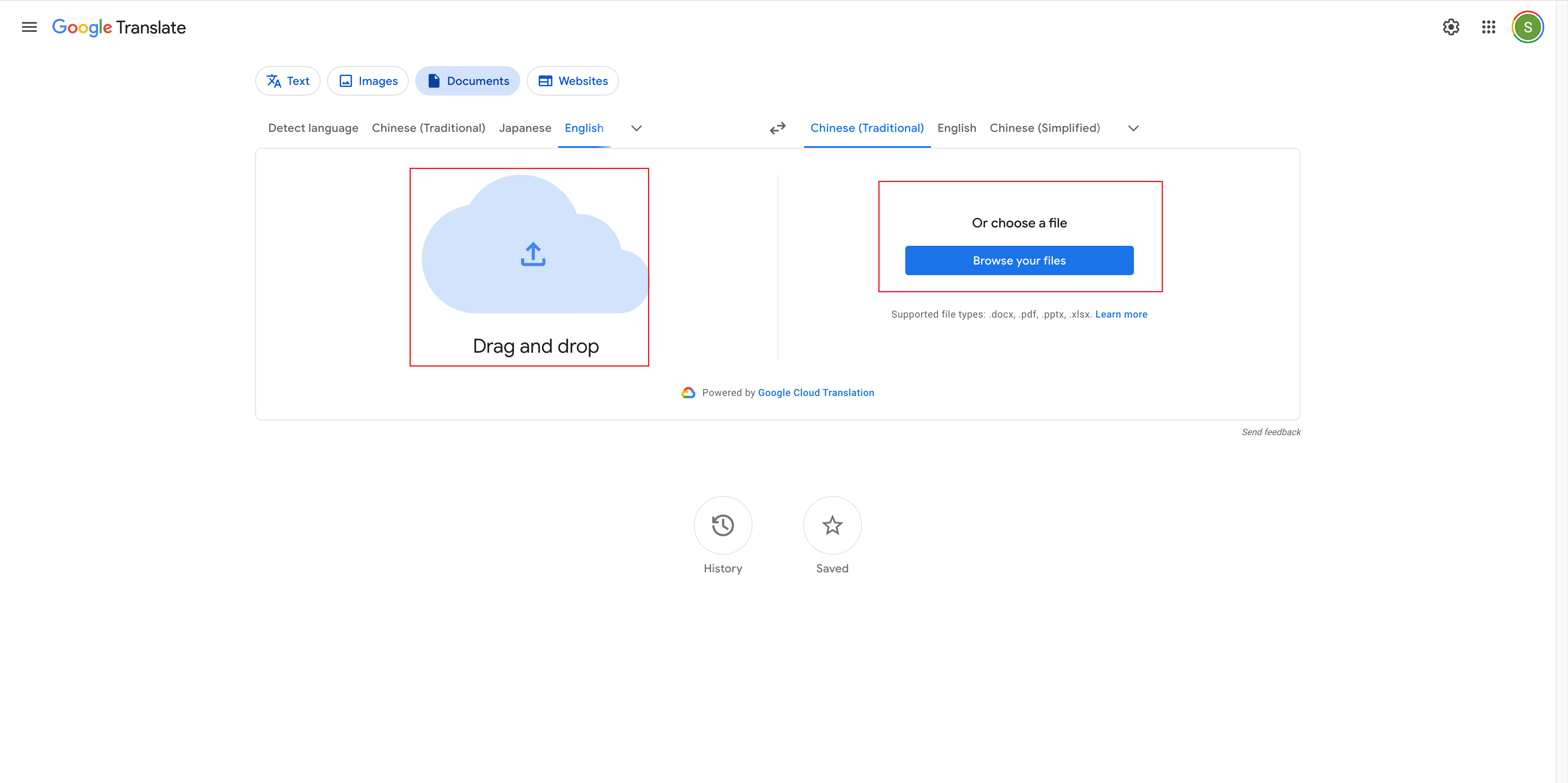 - 前往 Google 翻譯的「文件翻譯」功能頁面