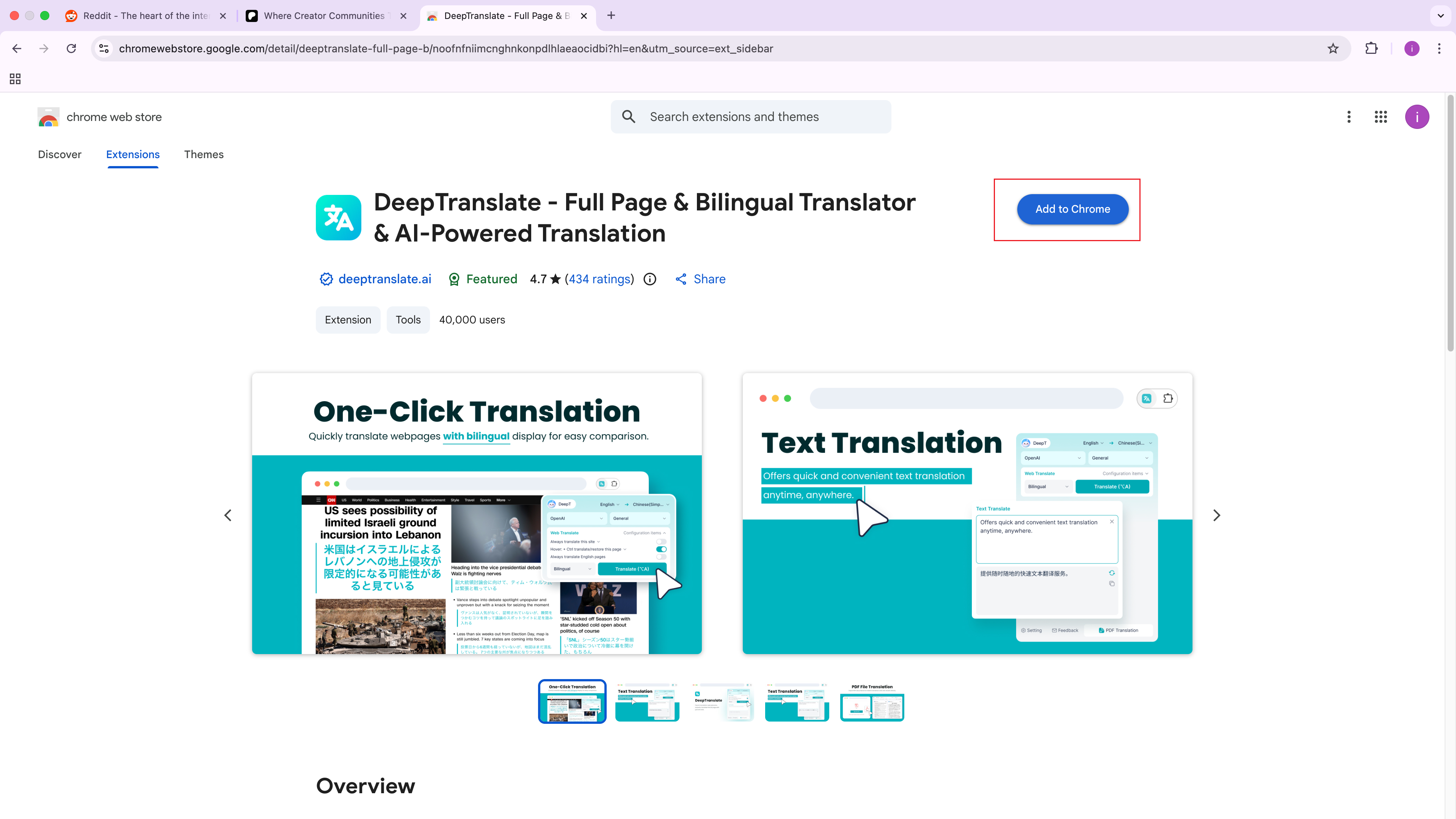 想用多种语言使用 Patreon,其中一种较灵活的方式是使用浏览器扩展。DeepTranslate 提供双语页面显示和全页翻译,让你用偏好的语言舒适地阅读 Patreon。