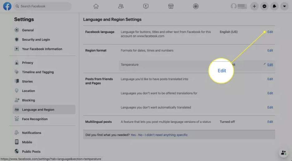 - 在「Facebook 语言」旁点击「编辑」,从下拉菜单中选择你偏好的语言。