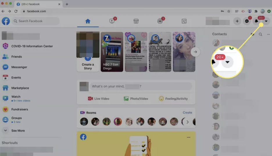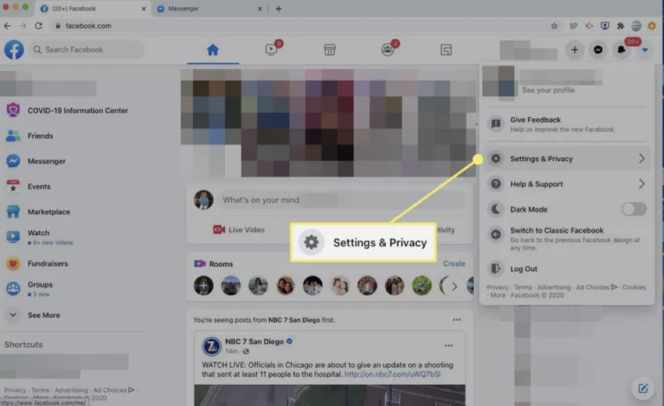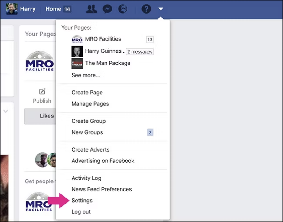 - 点击 Facebook 页面右上角的下拉箭头进入设置。