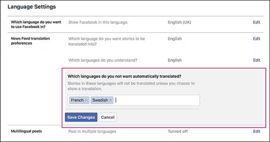 Facebook 的自动翻译有时有用,但并不总是理想。若觉得自动翻译不准确或不需要,可以关闭该功能: